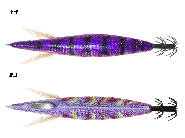 発色力が強いパープルを下地、上布に施し水中でハイアピールする2010年度NEWカラーです。昼夜関係なくお使い頂けるカラーですが藻場や夜間、マヅメ時に効果があり大型キャッチ率が高いことも特徴です。