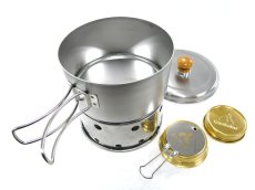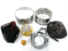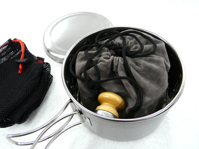 Gaobabuステンクッカー700ml(フタ付) + Gaobabuアルコールバーナー + 五徳ベース + 五徳ベース収納用きんちゃく袋 + 五徳ベース用風防 + マグネットつまみ + メッシュ収納袋 以上7点のお得なセット販売です。