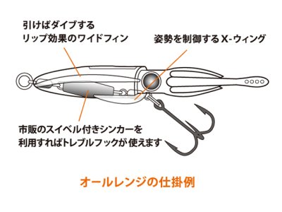 浮力を生かして根掛かりを避けたりシンカーで沈めるなど自由自在にコントロールでき、オフセットフックを使ってボトムを攻めたり、トレブルフックを使って表層・中層のシーバスやタチウオも狙えます。