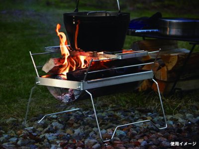 薪の加減がしやすい構造と、上下2段(幅約325mm/約275mm)のシェルフで火加減の調節がしやすく、大きな鍋を2つのせられる耐久性もあります。