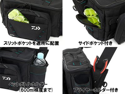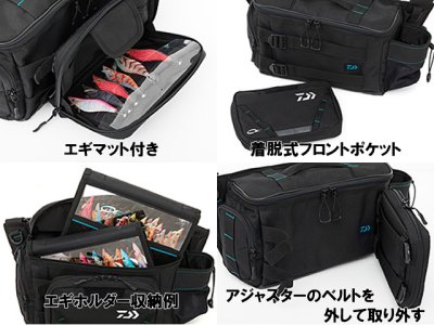 ■収納エギ本数目安:(3.5号エギ基準) (EMエギホルダーT L(B)=20本程度)×2個 (EMエギホルダーV L(B)=10本程度)×1個 フロントポケット=6〜7本程度 最大57本程度 ※エギの種類、大きさにより異なります