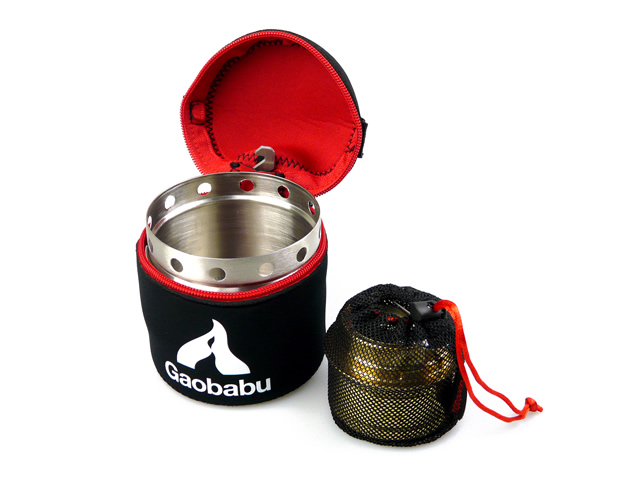 ■セット内容:Gaobabuキャリボ風防(専用クロス五徳+収納ポーチ付き)、GaobabuアルコールバーナーDEEPタイプ(深型)(メッシュ袋付き)
