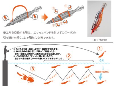 ”エギ+エサ”の融合により、釣りの技術が無くてもエギの動きや音でイカを寄せ、「エサの力」でイカを喰いつかせます。エサを付けることで、喰いついたらイカが離さないため、次の誘いでイカが引っ掛かるのです!