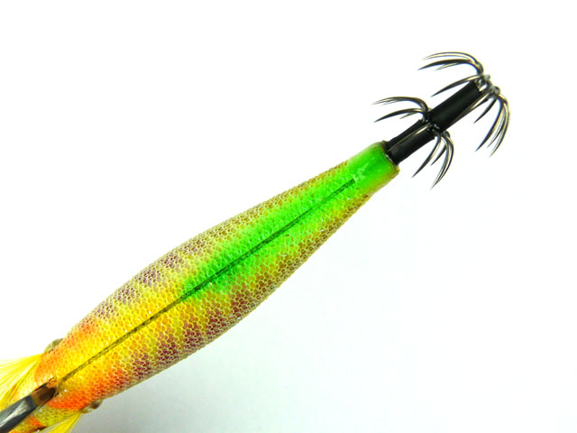 刺さりと強度を求めるべく、ステンレス製国産化研フックを使用し、鮎針と同様の刺さりを実現。強靭な刺さりを誇る針先は3kgを超えるようなモンスターの厚い蝕腕さえ簡単に貫きます。