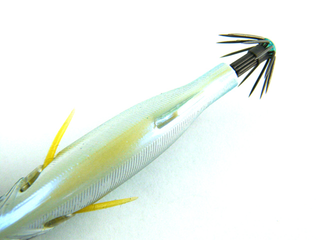 ボディー表面は布巻ではなく、ABS樹脂ボディーでアジをイミテートしたリアルな仕上がり。ボディー側面についたヒレは軟質系素材(エラストマー)。カラーをグロー・ブルーグロー・UVと設定し視覚的にもアピール!