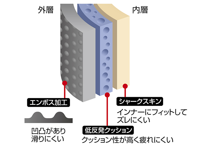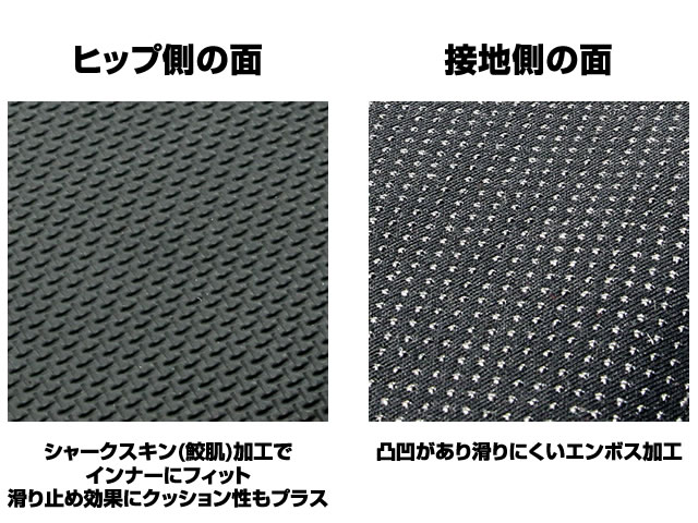 エンボス加工+低反発クッション+シャークスキンの3層構造でクッション性にすぐれ、ずれにくく滑りにくい仕様。