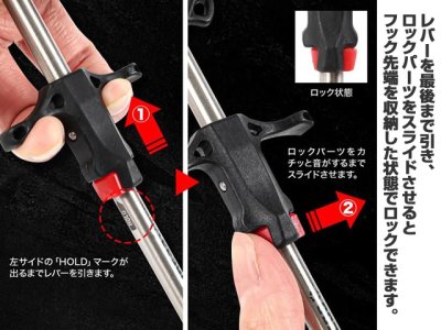 フック先端が収納できネットや服に引っ掛けない。持ち運び時の不意なトラブルも防ぎます。