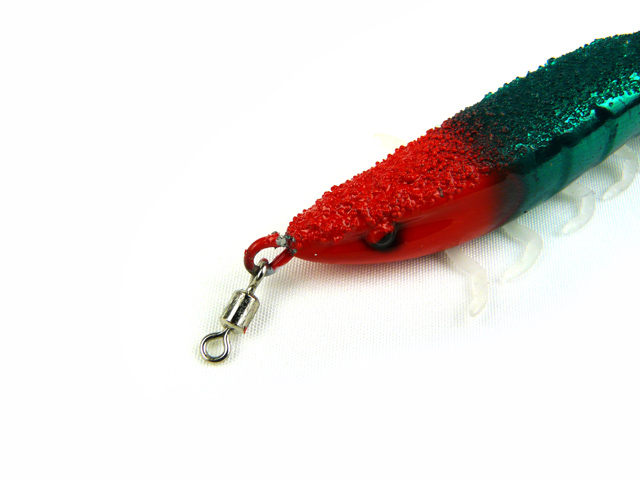 ボディー上部にはイカが触ってきた時に違和感を与えないように凹凸感、ざらつきのある表面加工を施し、ボディー下側に伸びた脚はボディーとは異なる軟質系素材(エラストマー)を採用し、フォール・アクション時に発生する艶かしいアクションが発生。