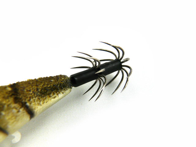 ロッドアクション後のポーズ姿勢はイカが抱きやすいとされる水平姿勢を保ち、アタリに備えます。ボディー表面は布巻ではなく、ABS樹脂ボディーとなっており、イカが触ってきたときに違和感を与えないよう凸凹感、ざらつきのある表面加工。