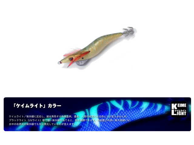 ケイムライト/紫外線に反応し、蛍光発色する特殊塗料。通常、人間の視覚には白色にしか見えませんが、ブラックライト(UVライト)等で強い紫外線を当てると、色を認識できます。色彩能力の高い魚や烏賊には、水中の自然光の紫外線でも充分発行しているのが見えます。