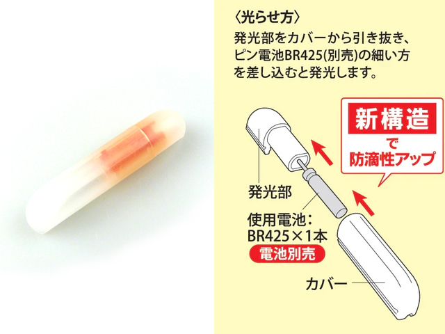 夜釣り用に開発された超極小“光る電池” マイクロサイズでとても軽いので超高感度釣法が可能。 ワンプッシュで点灯。 もちろん防水処理仕様で水の浸入によるショートがありません。 ワームにセットして集魚効…
