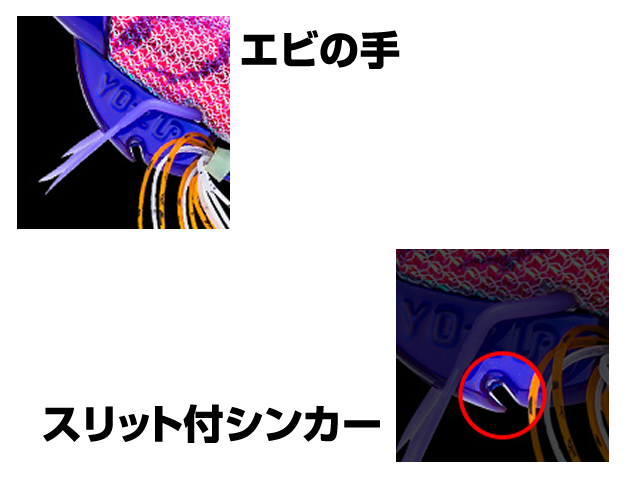 フォール時は、鳥毛の様に「沈下姿勢を安定」させ、アクション時にはふわふわ誘う「エビの足」。エギをとめた時に「ブレを軽減」します。