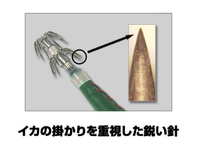 掛かりやすさと耐久性にこだわった国産針を使用。強度と刺さりやすさを考慮したφ0.7針。刺さってからはバレにくい丸曲げを採用。国産針の尖度だからこそできる丸曲げ。針の鋭さからフォール時に触ってくるイカもスッテの自重だけでオートマチックにフッキングし、フォール中のアタリも逃しません。