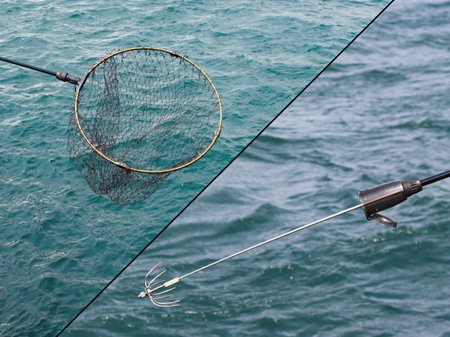 市販のランディングシャフトに取り付けイカギャフとして使用できます。一般的なランディングシャフト(ネジサイズ:ウィットネジ W1/2)にそのまま取り付け!タモとギャフの使い分けが可能。