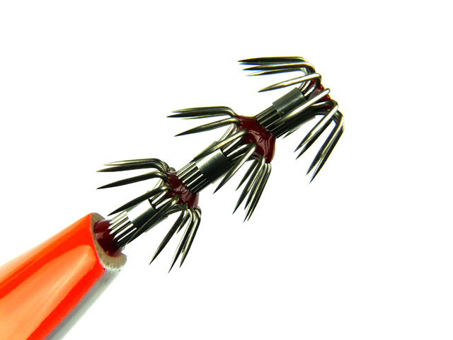 水を吸わないボディは姿勢を水平に保ち、3段針でガッチリとイカを掛けます。