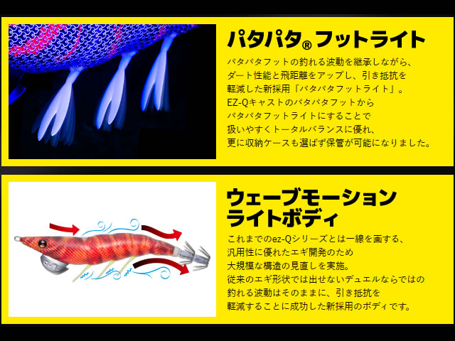 これまでのez-Qシリーズとは一線を画する、汎用性に優れたエギ開発のため大規模な構造の見直しを実施。従来のエギ形状では出せないデュエルならではの釣れる波動はそのままに、引き抵抗を軽減することに成功した新採用のボディです。