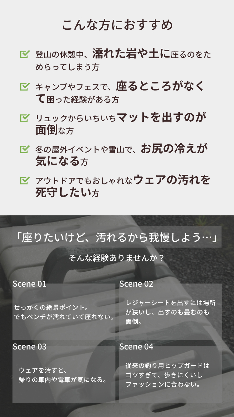 「座りたいけれど、地面が汚れていて座れない……」そんなアウトドアの不便を解消する、腰に巻くスタイルのヒップガード。先行販売のMakuakeでは、目標422%の支持をいただいた注目のアイテムです。
