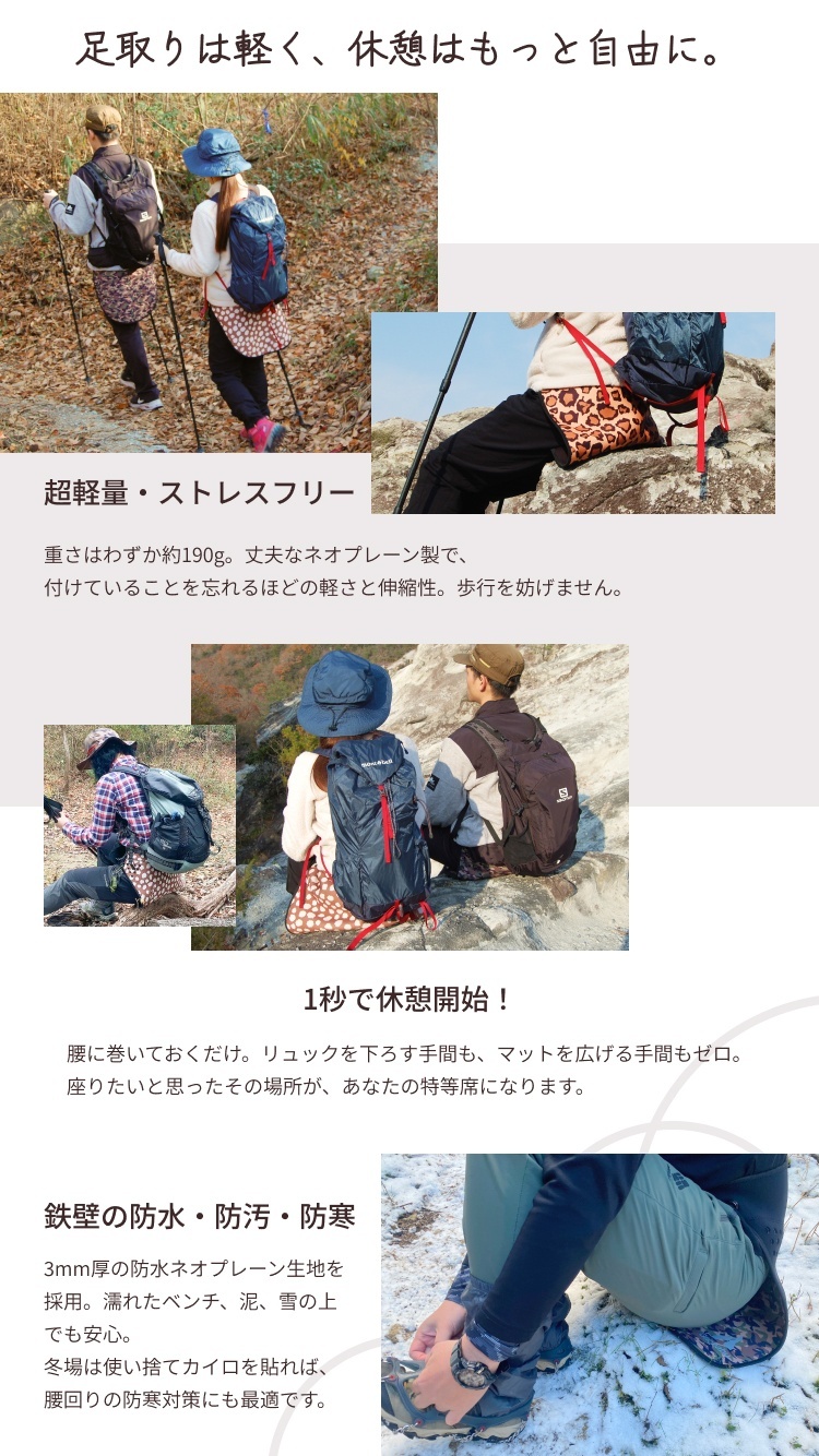 最大の魅力は、わずか約190gという超軽量設計。丈夫で伸縮性に優れた防水ネオプレーン生地を採用しており、付けていることを忘れるほどの軽快さで、アクティブな動きを妨げません。岩場や雪の上、濡れたベンチでも、腰に巻いておけばサッと座るだけで、そこがあなた専用の休憩所に早変わりします。