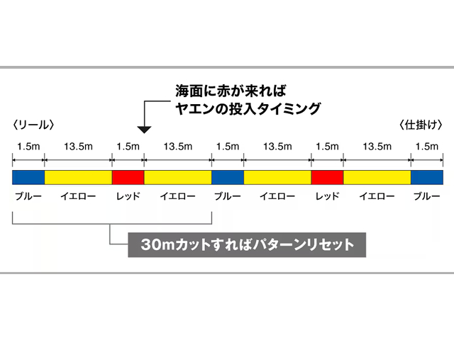 ベースカラーには視認性の高いイエローを採用。さらに、13.5m間隔で配置された赤のマーカーが海面に見えた時がヤエン投入のサインとなり、迷わずベストなタイミングを判断できます。