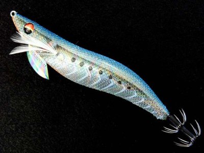 水中に溶け込むアイスブルーをバックカラーに配色したイワシ柄で警戒心の高いイカにオススメのナチュラルリアルカラーです。下地とシンカーには妖艶に光るレインボーカラーを配色。
