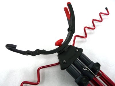上部ロッドホルダーに竿が掛けられる他、アーム部に数本立て掛けられます。ワンタッチロック機構で脚長一発調整。