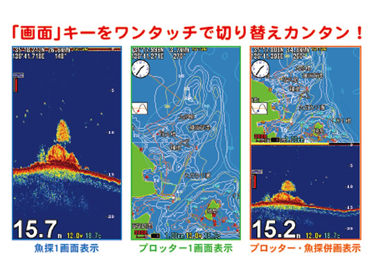従来モデルのケースに5型ワイド液晶を搭載したコンパクト設計。GPSアンテナ内蔵で、アンテナの配線が不要。全国詳細地図を内蔵しており、プロッター画面と魚探画面の同時表示が可能で、魚探画面の反応を見ながら気になるポイントをマーク入力できます。豊富な情報量とカラー表示で、分かりやすく目的地までナビゲートします。地図/魚探画面はワンタッチで簡単に切り替えできます。