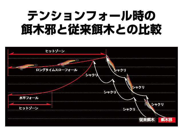 餌木邪は「スローダート」と「動と静のメリハリ」の2つをコンセプトに開発。ボディー全体をややファットに、背面部をフラットに設計することにより、ダートの速度を抑えています。また、フラットに設計した背面部が水流を受け、これまでの餌木では感じ取れなかった潮流の変化、エギのアクションや水中ポジションをアングラーに伝えやすくなっています。