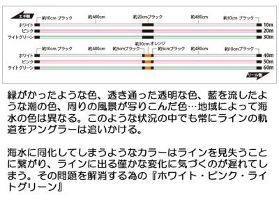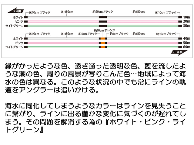 また、10m毎のカラーローテーションでシンプルで解りやすいマーキングパターン により、キャストやドリフトの距離の確認が“イージー”に把握できる。